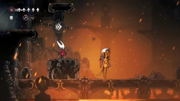 Although Hornet is given various acrobatic abilities, it will take a while to go from place to place on foot. Luckily, there are fast travel locations scattered throughout the kingdom. Unluckily, to unlock this, she has to go through a boss fight against the one thing that lets her fast travel: the Bell Beast. This is a major boss fight to act as a tutorial for Silk Spear, a skill that the player can obtain at the start of the game. When you reach the boss arena, you’ll find the beast trapped in silk, which is unbreakable by Hornet’s weapon, forcing her to use Silk Spear. Once she uses the ability, the boss fight begins. And when you eventually defeat it, you unlock the ability to travel to different locations.